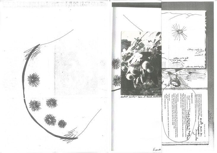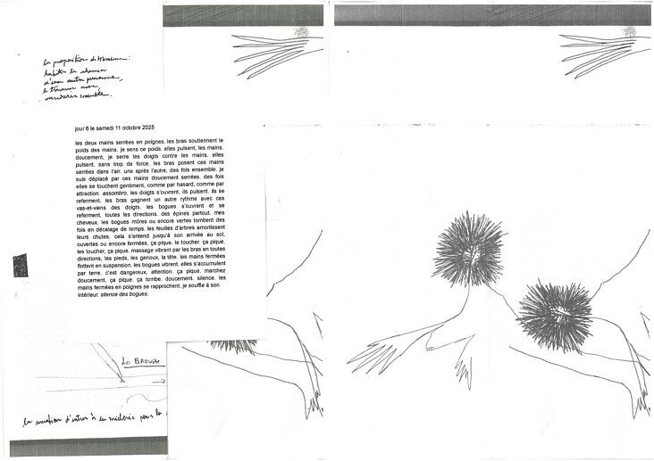 Les deux mains serrées en poignes. les bras soutiennent le poids des mains. je sens ce poids. elles pulsent, les mains. doucement, je serre les doigts contre les mains. elles pulsent. sans trop de force. les bras posent ces mains serrées dans l’air. une après l’autre, des fois ensemble. je suis déplacé par ces mains doucement serrées. des fois elles se touchent gentiment, comme par hasard, comme par attraction. assombro. les doigts s’ouvrent, ils pulsent. ils se referment. les bras gagnent un autre rythme avec ces vas-et-viens des doigts. les bogues s’ouvrent et se referment. toutes les directions. des épines partout. mes cheveux. les bogues mûres ou encore vertes tombent des fois en décalage de temps. les feuilles d’arbres amortissent leurs chutes. cela s’entend jusqu’à son arrivée au sol, ouvertes ou encore fermées. ça pique. le toucher. ça pique. les toucher, ça pique. massage vibrant par les bras en toutes directions, les pieds, les genoux, la tête. les mains fermées flottent en suspension. les bogues vibrent. elles s’accumulent par terre. c’est dangereux, attention. ça pique. marchez doucement, ça pique. ça tombe. doucement. silence. les mains fermées en poignes se rapprochent. je souffle à son intérieur. silence des bogues.