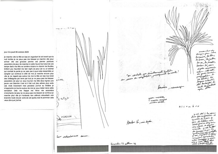 je marche vite la tête en bas en regardant le sol avant que la nuit tombe je ne peux pas me blesser je marche vite pour arriver vite ces grosses pierres ces pierres pointues assombro j’ai peur de marcher à cette heure tout seul j’ai une lampe dans ma tête sa lumière éclaire le chemin les feuilles brillent you haunted me last night j’ai peur j’ai vu un animal qui montait la pente je ne sais pas à quoi cela ressemble un sanglier qui continue à côté de moi je marche encore plus vite je ne regard pas autour de moi la tête en bas tout droit des châtaignes par terre par tout je ne peux pas me blesser assombro j’ai peur je veux tourner ma tête deux lignes une jaune une blanche c’est ici il fait nuit des arbres plus verts ces mots traversent mes pensées j’arrive au théâtre je m’approche je tourne autour de moi je veux rester dans cette sensation cela me frappe me frêne me assombra m’enchante j’ai peur je ne peux pas me blesser je continue je marche plus vite je n’entends rien silêncio assustado une branche toute douce verte de cet après-midi le pommier cela veux dire que j’arrive