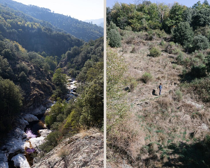 Entre le 6 et le 26 octobre 2025, nous avons habité l’Atelier Refuge sur le Sentier des lauzes à Saint-Mélany, en Ardèche. Pour rencontrer le terrain, marcher, danser et fabriquer des temps communs, nous, le chorégraphe Ametonyo Silva et le photographe Maxime Guedaly, en collaboration artistique depuis 2023, avons mis en relation nos pratiques situées. Lors de ces jours de résidence, nous avons eu plusieurs généreuses rencontres avec l’équipe de l’association et quelques habitant·e·s, ainsi qu’avec Anaïs Legris, Rebecca Lasselin et Mel García Lueches, qui nous ont rendu visite à différents moments de notre séjour.
