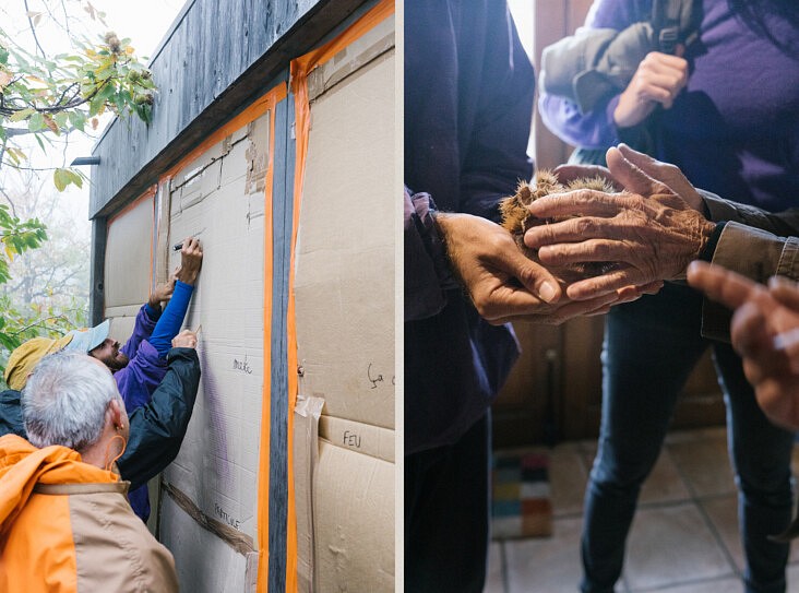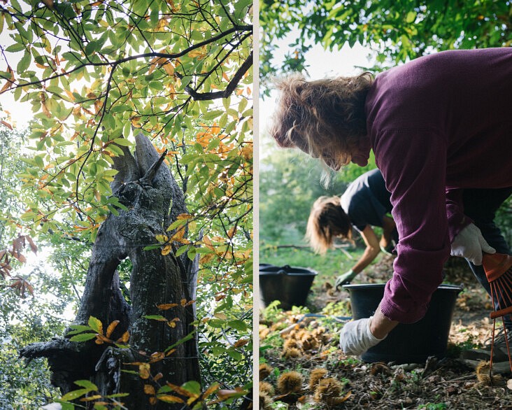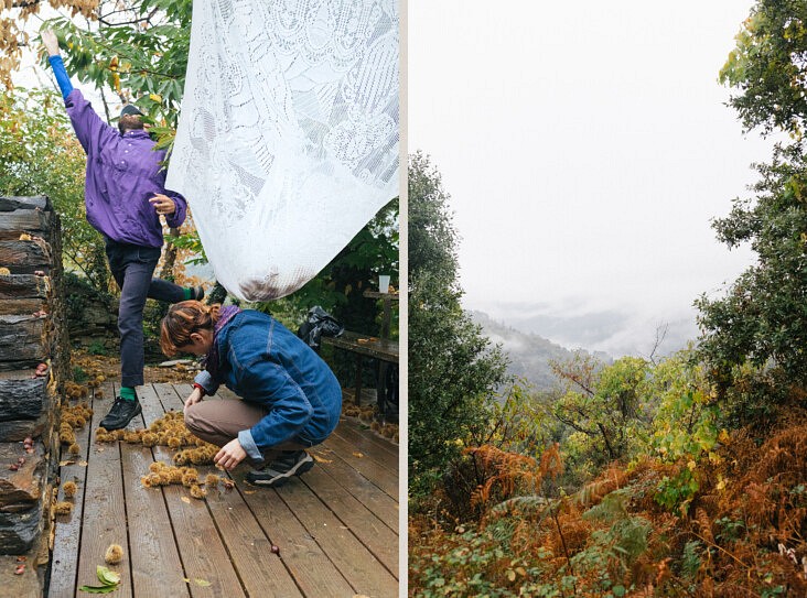 Les châtaignes, omniprésentes, du sol à l’iconographie locale en passant par le tissu économique du village et ses évènements festifs, se sont révélées comme la constellation qui a guidé notre relation avec le terrain. En convoquant ses présences, nous avons ainsi pu écouter des histoires de famille, partager des souvenirs à travers des photos, goûter des plats locaux et observer les gestes propres à sa récolte.