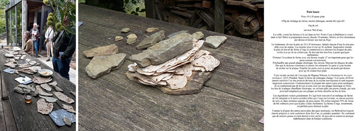 Pour la restitution, j’imagine un goûter des lauzes composé de pains plats – farines blé et châtaigne -, de sirops des terrasses – ronces, mûres et feuilles de figuier -, de fromages de brebis.